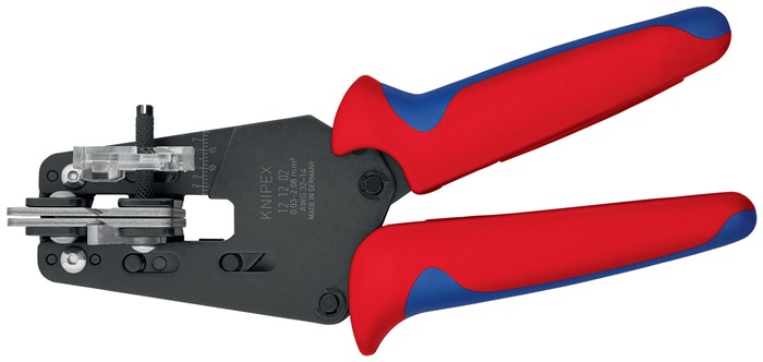 mit Formmessern · formschlüssiges Abisolieren auch von schwer zu entfernenden Isolierwerkstoffen aus PTFE, Silikon, Radox®, Kapton® und Gummi, auch mehrlagig · mit einstellbarem Längenanschlag für gleiche Abisolierlängen bei Serienarbeit · 4 auswechselbare Messer · Zangenkörper: Stahl · Messer: Spezial-Werkzeugstahl, ölgehärtet Zange brüniert
