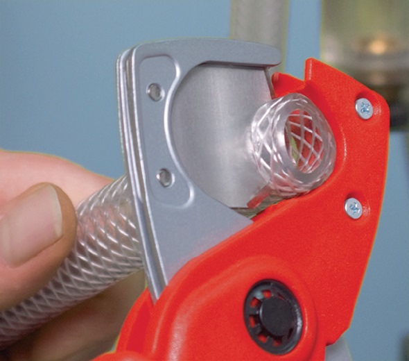 für Schläuche und Schutzrohre · zum Schneiden von dünnwandigen Kunststoffrohren (z. B. Kunststoff-Panzerrohre) und Schläuchen, auch gewebeverstärkt, aus Kunststoff und Gummi bis 25 mm Außen-Ø · mit Öffnungsfeder und Sperrklinke · Werkzeugkörper: Kunststoff, glasfaserverstärkt · Messer: Spezial-Werkzeugstahl, ölgehärtet, auswechselbar