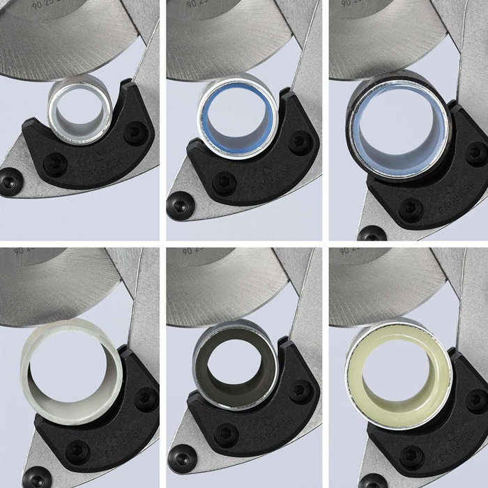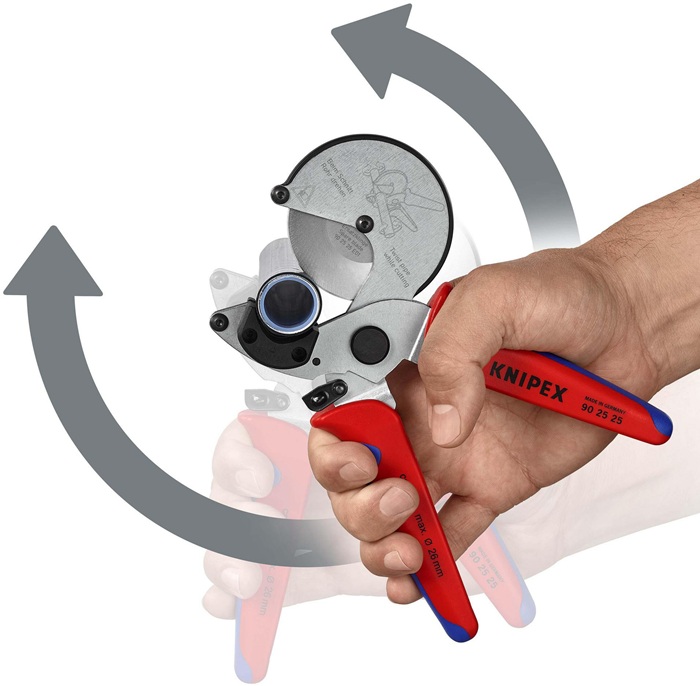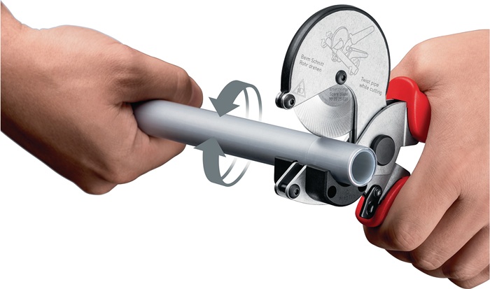 für Verbund- und Kunststoffrohre · frei drehbares Schneidrad für reibungsarmes Drehen des Rohrs · Rotationsbewegung ermöglicht müheloses Eindringen des Schneidrads bei minimierter Verformung des Rohrs · breite Kunststoff-Formauflagen für perfekt rechtwinklige Abschnitte · auch für Verbundrohre mit erhöhter Aluminiumschichtdicke (etwa Geberit Mepla) · mit Verschlussmechanismus Zange verzinkt · mit Mehrkomponenten-Hüllen