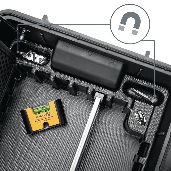 strapazierfähige Ausführung aus schlagfestem ABS-Material (Polypropylen) · staub-, wasserdicht und temperaturbeständig · extagroße Ausführung · flugtauglich · automatisches Druckausgleichventil · Rasterscharniere, die als Deckelhalter funktionieren · 2 abschließbare Kippschlösser · temperaturstabil von -30 °C bis +80 °C Ausführung: - 19 Werkzeugtaschen und 61 Halteschlaufen, 1 Werkzeugtafel im Deckel mit 13 Werkzeugtaschen auf der Bodenseite und 12 Werkzeugtaschen sowie einem Klemmfach (B.400 mm) auf der Deckelseite, 15 Werkzeugtaschen sowie einem Klemmfach (Breite 400 mm), durch 2 Druckknöpfe fixierbar - Bodenschale, Höhe 88 mm, durch flexible Einsätze unterteilbar und Abdecktafel mit 15 Werkzeugtaschen sowie einem Klemmfach (Breite 400 mm), durch 2 Druckknöpfe fixierbar - Verschließbare Bodenschale (H. 88 m) individuell unterteilbar durch Aluminium-Trennstegesystem - Dokumentenfach im Deckel - ergonomischen Zweikomponenten-Griff mit Griffmulde und leichtlaufenden Rollen - Belastbarkeit bis 30 kg