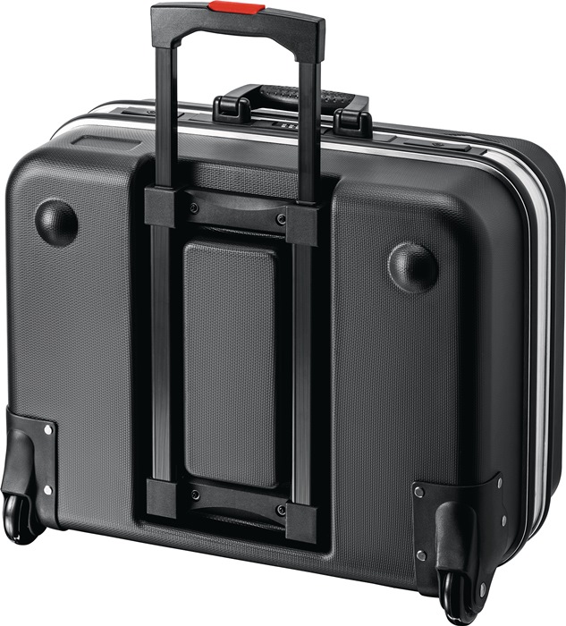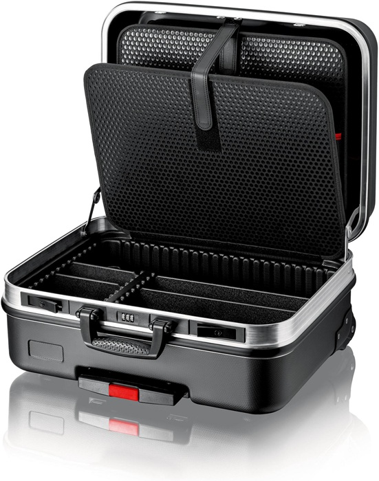 mit Trolly-Funktion · variable Bestückungsmöglichkeit · mit Bodenschale, Abdeckplatte, Dokumentenfach und Deckelhalter, 2 herausnehmbare Werkzeugtafeln aus schmutzabweisenden PP, Hohlkammerplatten mit 21 bestückbaren Separationen · aus ABS-Material mit umlaufendem Alu-Rahmen, Metallscharnieren und handfreundlichem Griff · Belastbarkeit bis zu 20 kg