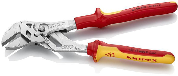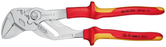 VDE-isoliert bis 1000 V · gefertigt gem. DIN EN/IEC 60900, stückgeprüft · ersetzt einen Satz Schraubenschlüssel, metrisch wie zöllig · glatte Backen für die schonende Montage von oberflächenveredelten Armaturen · Arbeiten direkt auf Chrom · Schnellverstellung per Knopfdruck · Chrom-Vanadin-Elektrostahl, geschmiedet, ölgehärtet Zange verchromt