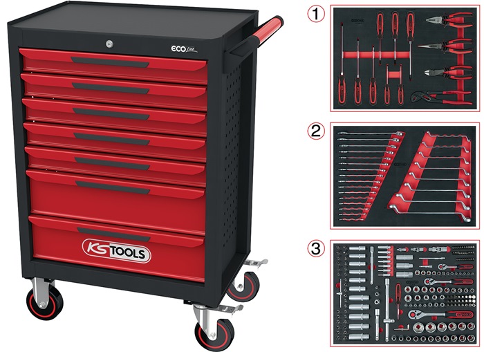 komplett mit 215-teiligem Werkzeugsortiment · mit 7 Schubladen auf kugelgelagerten Teleskopschienen (100% Auszug) · Seitenwände mit Vierkantlochung zum Anbringen verschiedener Zubehörteile · mit Selbsteinzug und SOFT-CLOSE-Funktion · stabile Stahlblechkonstruktion mit 0,8 mm Blechstärke - verwindungssteif · Zentralverriegelung aller Schubladen durch Zylinderschloss · Schubfächer mit rutschfester Gummieinlage · Arbeitsplatte mit 10 mm starker Schaumstoffeinlage · mit seitlichem Metallhandgriff · mit 2 Rädern à Ø 125 mm · mit 2 Lenkrädern à Ø 125 mm mit Roll- und Drehbremse · durchgehende Griffleisten · elektrostatisch pulverbeschichtet · kombinierbar mit Aufsatz Maß über alles aufgebaut mit Griff und Rädern (B x T x H) 748 x 459 x 1014 mm Innenmaß Schubladen (B x T x H) 5 x 565 x 395 x 75 mm Innenmaß Schubladen (B x T x H) 2 x 565 x 395 x 150 mm Tragkraft pro Schublade 25 kg / statische Gesamtbelastbarkeit 300 kg