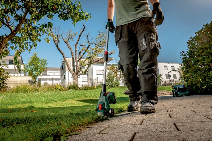 werkzeugloser Schnellwechsel der beiden lasergeschnittenen und diamantgeschliffenen Messer · Sicherheitsschalter und Messer-Schnellstopp · maximale Laufruhe · gummierter Griffbereich · Teleskopstange für rückenschonendes, exaktes Schneiden von Rasenkanten als Zubehör erhältlich
