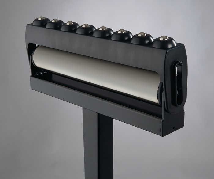 Kombiständer mit abschwenkbarem Rollenträger · Materialzufuhr über die Tragrolle oder den Kugelrollen-Träger möglich · 2-Fuß-Stahlkonstruktion, schwarz lackiert · Tragrolle Stahl verzinkt Ø 60 x 1,5mm · Kugelleiste mit 8 Kugeln · stufenlose Höhenverstellung, zusammenklappbar · Niveauausgleich für unebene Böden · Tragfähigkeit 200 kg · Flächenlast auf der gesamten Auflagenbreite