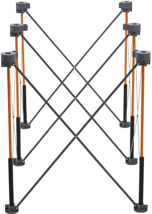 flexible Lösung für Baustelle, privaten Arbeitsbereich oder Werkstatt · robuste Stahlkonstruktion · flexible Abstandshalter, um den Aufprall schwerer Gegenstände und Maschinen zu absorbieren · langlebige Polymer-P-Tops: P-Tops an jedem Kontaktpunkt markieren nicht die Oberfläche des Projekts und lassen die Sägeblätter keine möglichen Schäden an den Abstandshaltern verursachen · in Sekundenschnelle ist ein 0,6 m x 1 m großer Arbeitsplatz eingerichtet · Abmessungen: Höhe 76 cm Breite 64 cm Länge 124 cm