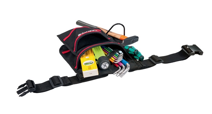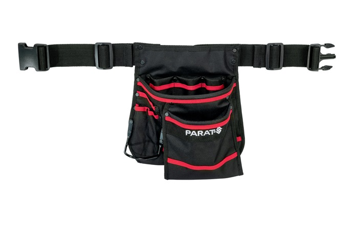 aus strapazierfähigem Nylon · schwarz/rot · Platz für insgesamt 9 Werkzeuge · Hammerhalter · inkl. verstellbarem Gürtel mit Steckschloss