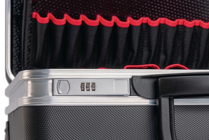 Doppel-Aluminiumrahmen · robuste, rutschfeste X-ABS Außenschale · bis zu 50 Werkzeuge lassen sich in zwei Werkzeugtafeln sicher verstauen · frei unterteilbare, mit 88 mm extratiefe Bodenschale · mit Wasserwaagen-Halterung sowie Visitenkartenfächer, Stiftschlaufen und Dokumentenfach im Kofferdeckel · bis zu 30 kg belastbar · 4-fach-Teleskopauszug · große Leichtlaufrollen · Rasterscharniere mit praktischer Kofferdeckelarretierung mit Zahlenschloss