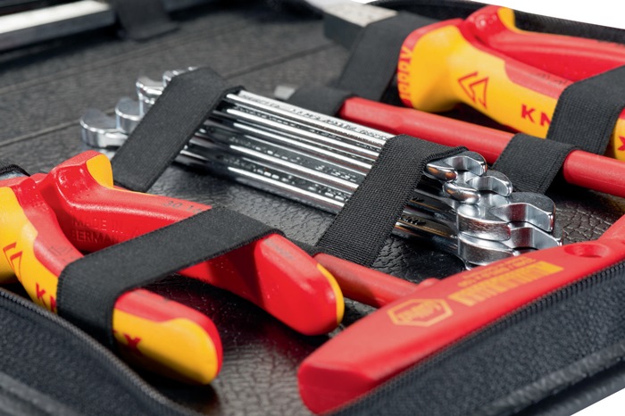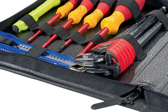 kompakt · aus Industrieleder · schwarz · umlaufender Reißverschluß · Tasche aufklappbar · mit 25 vernähten Gummischlaufen zur Aufnahme von Werkzeug