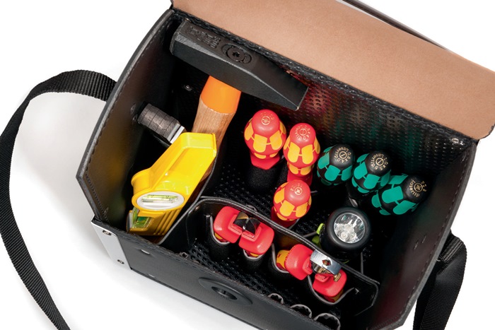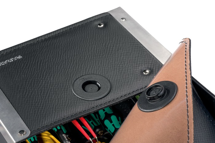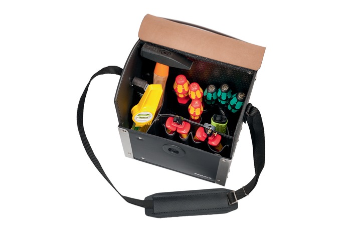 aus Rindleder mit Mittelwand aus extra dickem Rindsleder, schwarz · Vorder-, Rück- und Mittelwand mit insgesamt 17 Einsteckfächern · durchsichtiges Klemmfach im Deckel · verstellbarer Trageriemen · Taschenkörper aluwinkelverstärkt Besondere Produktvorteile: · durch die Höhe erlaubt diese Tasche auch die Aufnahme eines Hammers oder extra langen Schraubendrehern · das Schloß, welches durch seine praktische Drehfunktion auch einhändig zu bedienen ist, schließt durch einen magnetischen Verschluß von selbst