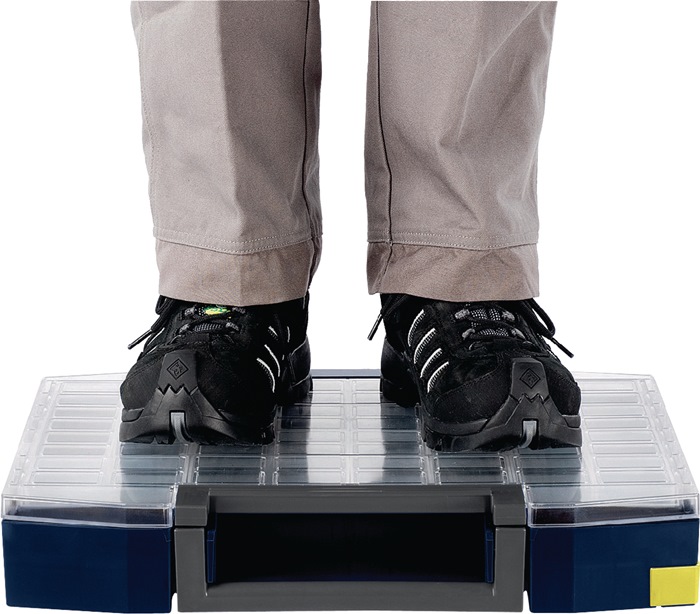 praktischer Tragerahmen aus stabilem Polypropylen zur mobilen Lagerung von Kleinteilen · mit ergonomisch geformtem Tragegriff · Transportsicherung gegen Herausfallen der Koffer · mit 4 Sortimentskoffern
