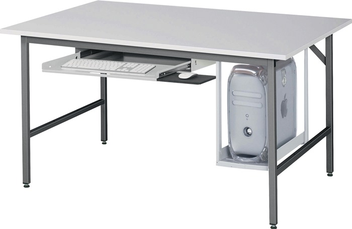Untergestell aus Profilstahlrohr 30 x 30 mm mit integrierter Höhenverstellung · Querstreben oben (vorne und hinten) · Tragfähigkeit max. 300 kg bei gleichmäßig verteilter statischer Flächenlast · Melamin-Platte mit Melaminharz-Direktbeschichtung nach DIN 68765, bedingte Kratz- und Stoßfestigkeit · Stärke 22 mm · umweltfreundliche Pulverbeschichtung in anthrazitmetallic, ähnlich RAL 7016 · zerlegte Anlieferung, einfache Montage