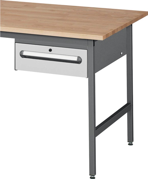 Untergestellt aus Profilstahlrohr 60 x 30 mm mit integrierter Höhenverstellung · Querstreben oben · Aussteifungstraversen hinten · Tischhöhe von 760-1080 mm einstellbar · Tragfähigkeit max. 500 kg bei gleichmäßig verteilter statischer Flächenlast · Buche-Massiv-Platte oberflächenbehandelt, Kanten abgerundet, für hohe Beanspruchung und Belastbarkeit, Stärke 25 mm · umweltfreundliche Pulverbeschichtung in anthrazitmetallic, ähnlich RAL7016 · zerlegte Anlieferung, einfache Montage