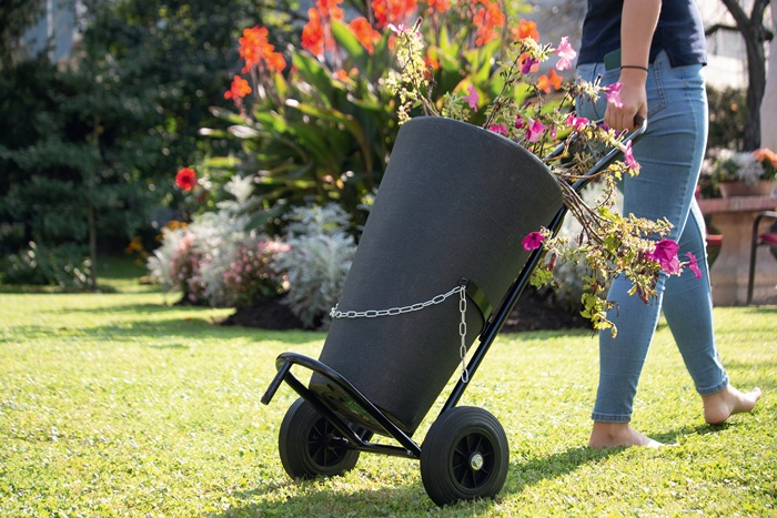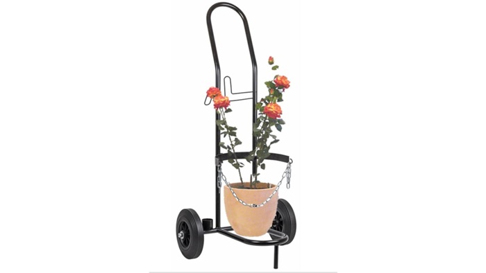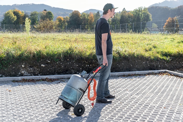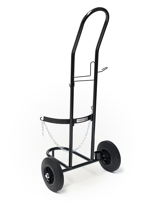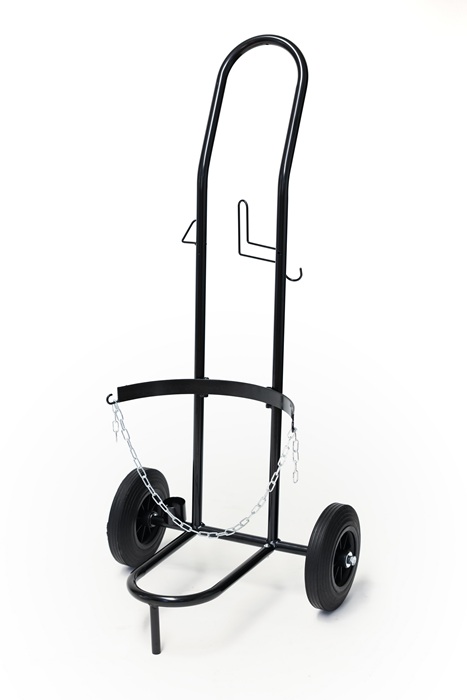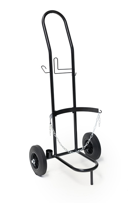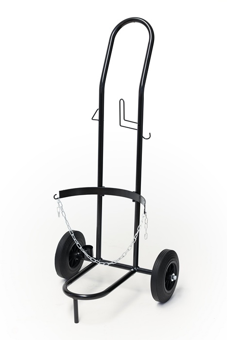 mit praktischen Halterungen für Gasschlauch und Brenner · verstellbare Kette zum Sichern der Flasche · stabile Räder mit Vollgummireifen