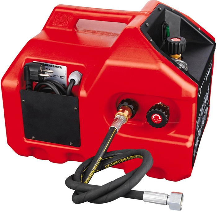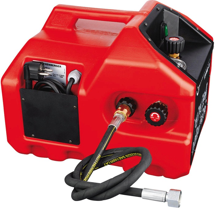 selbstansaugende elektrische Befüll- und Prüfpumpe bis 40 bar · komfortables automatisches Befüllen und Abdrücken von Leitungssystemen und Behältern · kompaktes und robustes Kunstoffgehäuse für einfaches Handling auf der Baustelle · Flüssigkeitszufuhr frei wählbar: selbstansaugend oder aus einer Druckquelle · geeignet für Öl, Wasser, Glykol · mit Stahlgewebe verhindert Messfehler, die durch Aufweiten des Schlauches im Betrieb entstehen können · glyceringedämpftes Manometer gleicht Druckstöße aus, dadurch einfaches Ablesen des Drucks