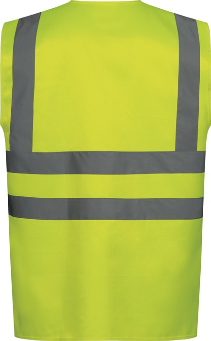 EN ISO 20471 Kl. 2, EN ISO 13688 · Obermaterial: 100% Polyester · mit Schulterreflex · mit robustem Front-Reißverschluss · einzeln im PE-Beutel verpackt · 1 Brusttaschenkombination links mit Handytasche und Stifttaschen · 1 Ausweistasche · 2 Zwei-Wege-Hüfttaschen