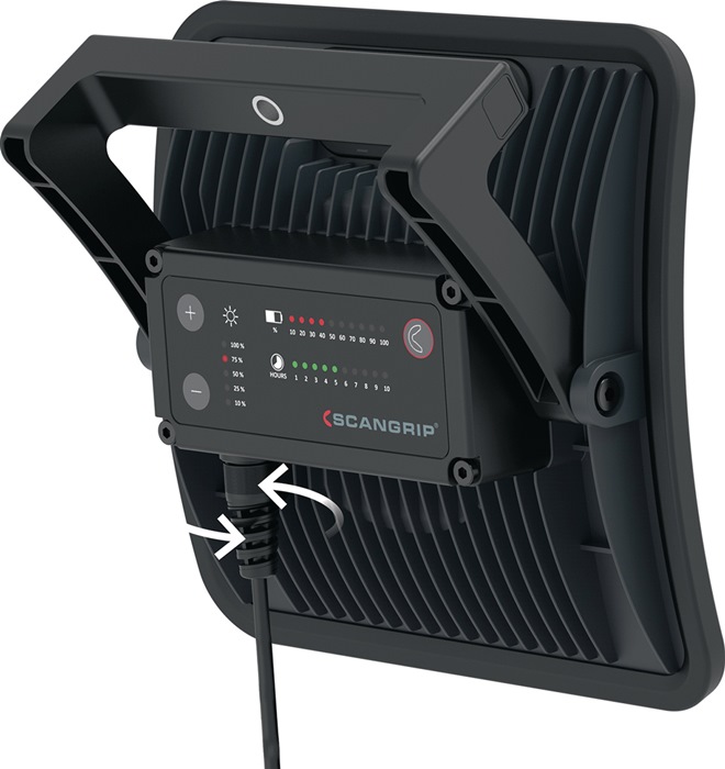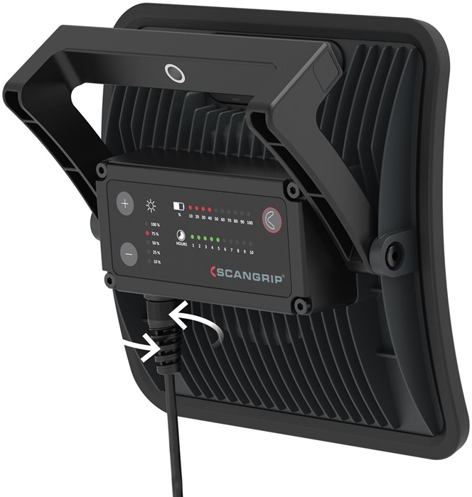 wiederaufladbare LED-Arbeitsleuchte mit 4000 Lumen · tragbar · kann mit oder ohne 5 m Gummikabel verwendet werden · wasser- und staubdicht (IP67) · mit einem integriertem Tragegriff und einer flexiblen Halterung für den einfachen Transport und zur Montage an einem SCANGRIP TRIPOD Stativ · mit 90 LEDs · einstellbare Lichtleistung · separate Anzeigen für Restlaufzeit und Batteriestand