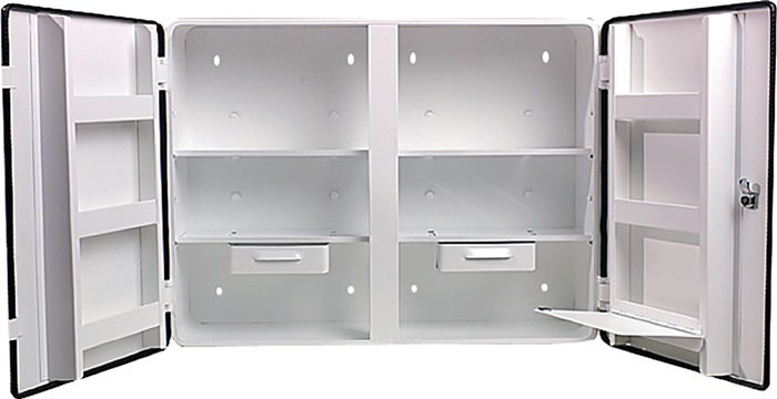 aus Stahlblech, weiß · 2-türig · Sicherheitsschloss, 2 Schlüssel · 4 Einlegeböden, 2 Schubladen · Türen mit je drei Ablageschalen · Montagematerial, zusätzlich klappbares Ablagetableau zur hygienischen Zwischenlagerung von Verbandmaterial bei der Erste Hilfe Leistung · erweiterbar durch 1 Medikamentenfach, 2 Zusatzböden und bis zu 4 Schubladen