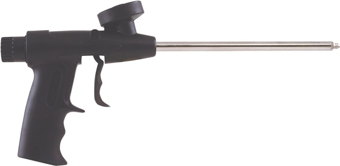 stabile Metallpistole · abgesetztes Pistolenrohr für hohe Stabilität · leicht justierbar durch griffige Messingstellschraube · zum Verarbeiten von 1K-PU-Pistolenschaum