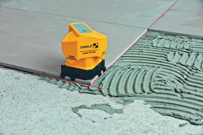 für Fliesenleger, Bodenleger und Trockenbauer · schnelles und sauberes Arbeiten bei der Verlegung von Fliesen, Parkett, Laminat, Teppich oder PVC · gerade Laserlinien im 90° Winkel mit einem Knopfdruck · Umsteck-Sockel mit Positionierungskrallen für Fliesenverlegung