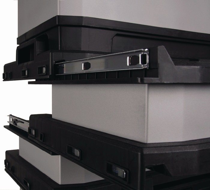 robuste Kombination aus Kunststoff und Metall · zwei separat nutzbare Elemente · zwei tiefe Schubladen für Zubehörteile · ein großes Staufach (z. B. für Elektrowerkzeuge) · Schubladenelement mit entnehmbaren Einsätzen