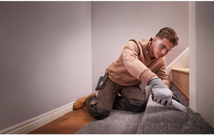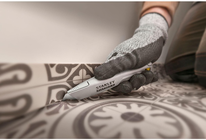 für Bodenlegerarbeiten und zahlreiche Anwendungen im professionellen Handwerk · silber · ergonomisches, lineares Design · Klingenhalter aus gehärtetem Stahl · Rändelrad und Schulterschraube komplett aus Metall für schnelles Verriegeln und Entriegeln · magnetischer, geteilter Klingenspeicher für bis zu 10 Ersatzklingen · Ergonomie für ein- und zweihändiges Schneiden