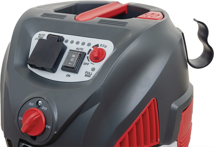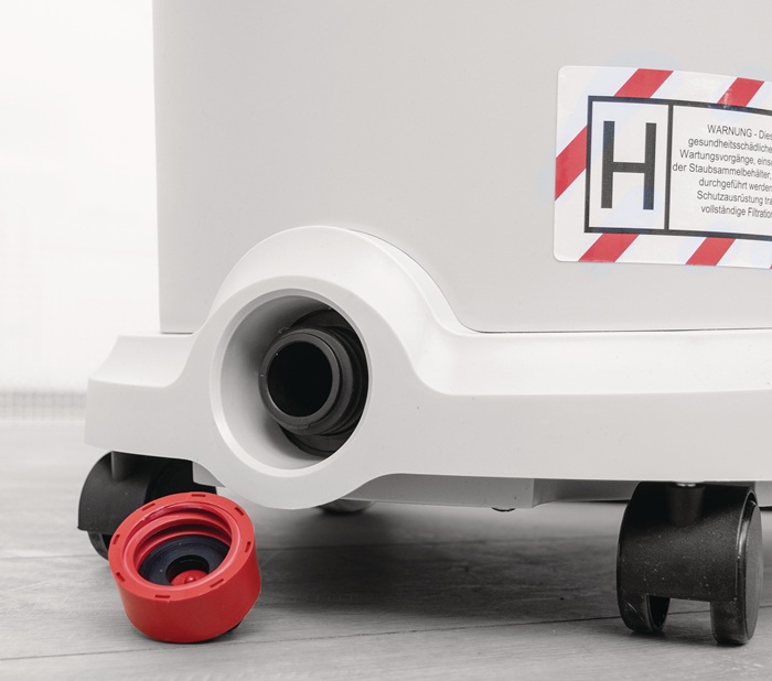 Filterfläche 3500 cm² · Ablassschraube zum Entleeren von Flüssigkeiten · Zubehör-, Kabel und Schlauchaufbewahrung am Gerät · PressClean manuelle Filterabreinigung · Volumenstrom-Überwachung mit optischem und akustischem Warnsignal · Stand-by LED · Sauger antistatisch vorbereitet · Gerätesteckdose mit Einschaltautomatik - stufenloser Drehzahlsteller · Staubklasse M