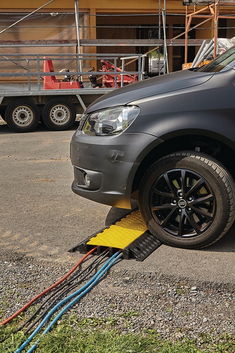 mit drei Kanälen · zum Schutz von Schläuchen oder Kabeln, die nicht dauerhaft verlegt sind · Abmessung Kabelkanäle H 50 x B 68/57/65 mm · keine Befestigung nötig · aus schwarzem vulkanisiertem Vollgummi und rutschhemmende Oberfläche · mit gelben Schutzdeckel und Tragegriff · überfahrbar bis zu einem Achsgewicht von 4 t · Endlosmontage mit Zapfen/Nut-System
