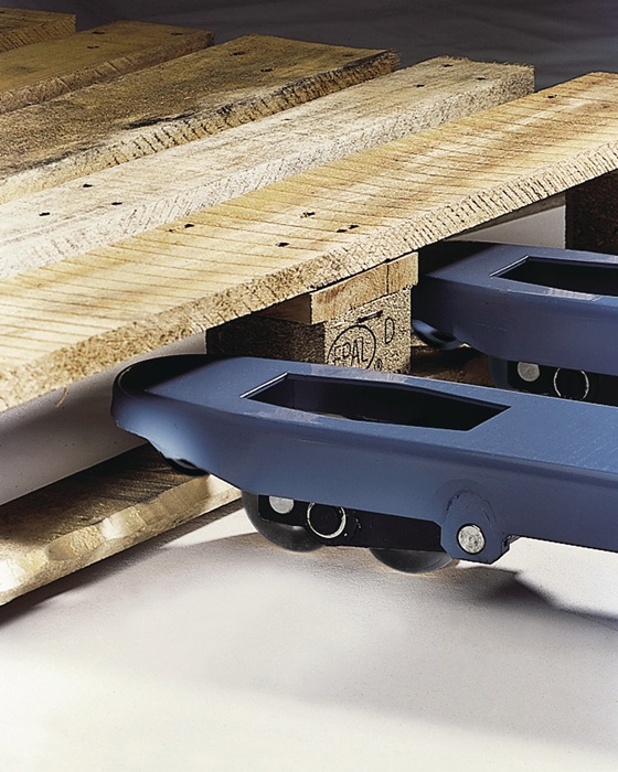 robuste, verwindungssteife Stahlkonstruktion · Sicherheitsdeichsel mit den Funktionen Heben - Fahren - Senken, verstärkter Deichselfuß · Hydrauliksystem wartungsarm · Überlastsicherung · dosierbare Senkgeschwindigkeit · Einfahrrollen für problemloses Einfahren in die Breite von Europaletten · Oberflächenschutz durch hochwertige Mehrfachlackierung in taubenblau, RAL 5014
