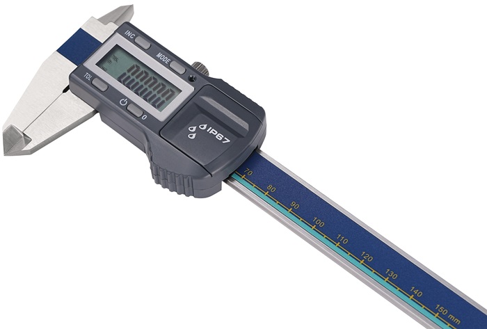 digital · IP67 · Messsystem unempfindlich gegen Staub und zeitweiliges Eintauchen in Wasser · mit Feststellschraube und Kreuzspitzen · LCD-Anzeige 9 mm · mit Toleranzfunktion: zweimalige Warngrenz-Eingabe (Toleranzfeld Min./Max.), zur optischen Unterstützung beim Prüfen von bspw. Serienteilen · der kleine LED-Spot leutet grün auf, sofern sich das Messergebnis innerhalb des eingegebenen Toleranzfelds bewegt · außerhalb des Toleranzfelds bleibt der LED-Spot erloschen Funktionen: Ein-/Ausschaltung · Schnell-Start-Funktion, automatische Einschaltung der Elektronik durch Schieb-Bewegung, Schieber sofort messbereit durch einmaliges Nullsetzen · mit Toleranzfunktion (Warngrenzen-Eingabe) · mm/inch · Nullpunktsetzung an jeder Stelle · Einfrierung der Anzeige (Tastensperre) · Elektronik schaltet nach ca. 5 Minuten eigenständig ab