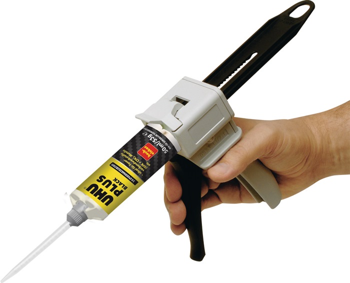 für UHU-Doppelkammerkartuschen · ergonomische Hebelmechanik · günstige Hebelwirkung · einfache Aufnahme der Kartuschen · feindosierter Vorschub · kein Nachlaufen des Klebstoffes · passend zu Art.-Nr. 4000 353 414, 4000 353 417, 4000 353 418 und 4000 353 358