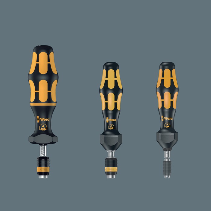 ISO 6789 · Wera Drehmomentschraubendreher · sicherer Schutz vor elektrostatischer Energie und damit verbundenen Schäden · variable Drehmomenteinstellung bei höchster Genauigkeit · einfache Einstellung des benötigten Drehmomentwertes ohne Sonderwerkzeug · gute Ablesbarkeit des Skalenwerts · Rapidaptor-Schnellwechseltechnologie für blitzschnellen Bit-Wechsel · unbegrenztes Lösemoment zum Lösen festsitzender Schrauben · mehrkomponentiger Kraftform-Griff mit Hart- und Weichzonen für hohe Arbeitsgeschwindigkeiten und zur Schonung der Handfläche · geeignet für Bits mit 1/4″-Außensechskantantrieb nach DIN ISO 1173-C 6,3 und E 6,3 (ISO 1173)
