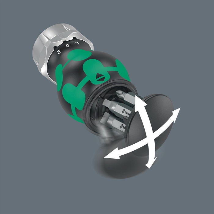 Die im Griff integrierte Ratsche mit Feinverzahnung sorgt für schnelles Arbeiten · die innovative Ratschenmechanik ermöglicht einfaches „Zwirbeln“ · ein echter Problemlöser bei fehlendem Widerstand der Schraube · intuitives Umschalten: Schalte ich nach rechts – schraube ich nach rechts, schalte ich nach links – schraube ich nach links · integriertes Bit-Magazin mit 6x 25 mm Bits · zähharte Bits für den universellen Einsatz