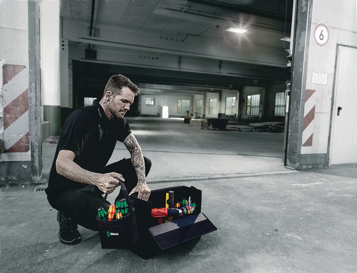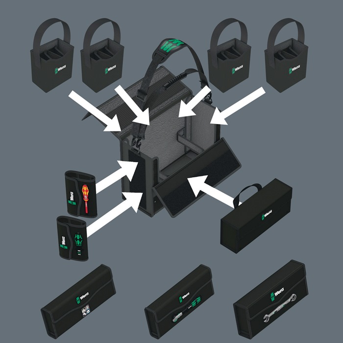 Der Wera 2go 2 XL Werkzeug-Container mit extra tiefen Fächern ist mit seinem Klettsystem und seiner Kompaktheit die ideale Lösung für einen individuellen und bequemen Werkzeugtransport. Die innen- und außenliegenden Klettzonen sorgen für extrem hohe Flexibilität und Raumausnutzung. Dadurch passt unglaublich viel Werkzeug in und an den Container. Wera 2go 2 sorgt für leichtes Gepäck · denn nur die wirklich benötigten Werkzeuge werden mitgenommen. Das robuste und formstabile Material schützt die mitgeführten Werkzeuge vor Beschädigungen und Nässe und erhöht die Lebensdauer des Werkzeug-Containers. Der gepolsterte und verstellbare breite Tragegurt und die eng am Körper anliegende Position des Containers verschaffen einen angenehmen Tragekomfort. Die Hände bleiben beim Transport frei. Inklusive 1 Köcher Wera 2go 4 mit individuell einstellbarem Klett-Teiler für Schraubendreher und weitere Werkzeuge. 4 dieser Köcher können mühelos verstaut werden. Vorteile: Wera 2go 2 XL Werkzeug-Container mit extra tiefen Fächern für z. B. Wera Köcher Wera 2go 4. Individuell konfigurierbar für hohe Mobilität. Ideal auch zum Andocken der textilen Wera Boxen und Taschen mit Vlieszone. Leichtes Ein- und Ausräumen. Hände bleiben beim Transport frei. Der Wera 2go 2 XL Werkzeug-Container mit extra tiefen Fächern ist mit seinem Klettsystem und seiner Kompaktheit die ideale Lösung für einen individuellen und bequemen Werkzeugtransport. Die innen- und außenliegenden Klettzonen sorgen für extrem hohe Flexibilität und Raumausnutzung. Dadurch passt unglaublich viel Werkzeug in und an den Container. Wera 2go 2 sorgt für leichtes Gepäck · denn nur die wirklich benötigten Werkzeuge werden mitgenommen. Das robuste und formstabile Material schützt die mitgeführten Werkzeuge vor Beschädigungen und Nässe und erhöht die Lebensdauer des Werkzeug-Containers. Der gepolsterte und verstellbare breite Tragegurt und die eng am Körper anliegende Position des Containers verschaffen einen angenehmen Tragekomfort. Die Hände bleiben beim Transport frei. Inklusive 1 Köcher Wera 2go 4 mit individuell einstellbarem Klett-Teiler für Schraubendreher und weitere Werkzeuge. 4 dieser Köcher können mühelos verstaut werden.