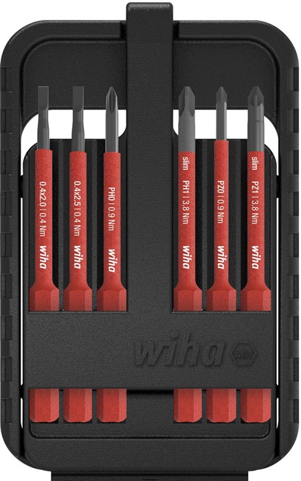 VDE-isoliert · gefertigt gemäß IEC 60900:2012 · Schutzisolation im vorderen Bereich vollständig integriert · alle slimBits 75 mm lang (Antrieb: 6 mm Außensechskant) Zur Verwendung mit VDE-isolierten Drehmomentgriffen und VDE isolierten-Bithaltern (gehören nicht zum Lieferumfang - bitte separat bestellen) Inhalt: je 1 slimBit für Schlitzschrauben Gr. 3,5 / 5,5 mm je 1 slimBit für Schrauben mit Kreuzschlitz (PH) Gr. 1 / 2, (PZD) Gr. 1 / 2 je 1 slimBit für Schrauben mit Plus/Minus-Profil (+/- PZD) Gr. 1 / 2 je 1 slimBit für Innen-TORX®-Schrauben Gr. T 10 / 15 / 20 / 25